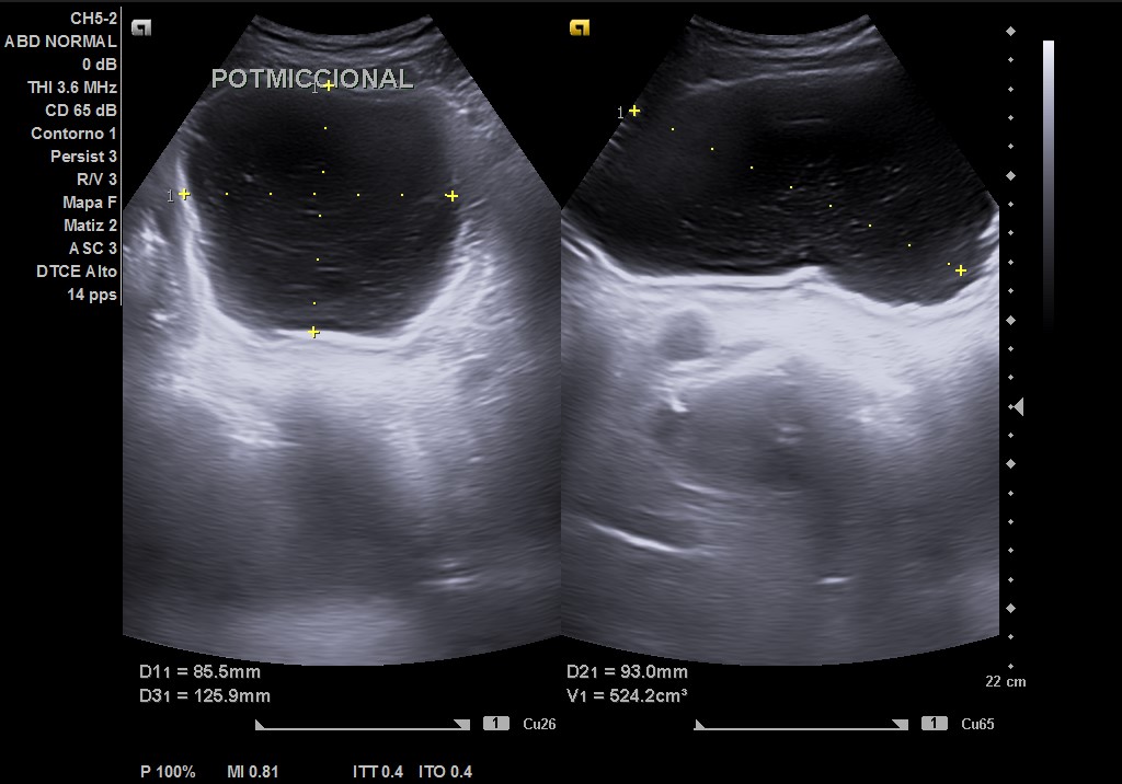 Ecografía tras ingerir 1 litro de agua y sin orinar posteriormente, con sonda convex: se visualiza vejiga repleccionada hasta 2 cm del ombligo, con > 550 cc (difícil de cuantificar por gran tamaño). Residuo postmiccional 525 cc, paredes de vejiga con signos de lucha, divertículo e imagen de «centelleo» en desembocadura de uréter derecho, pero sin afección del jet ureteral ipsilateral. Próstata de 67 cc aproximadamente, que protruye en vejiga. Riñones con ecoestructural normal sin dilatación en vía excretora.