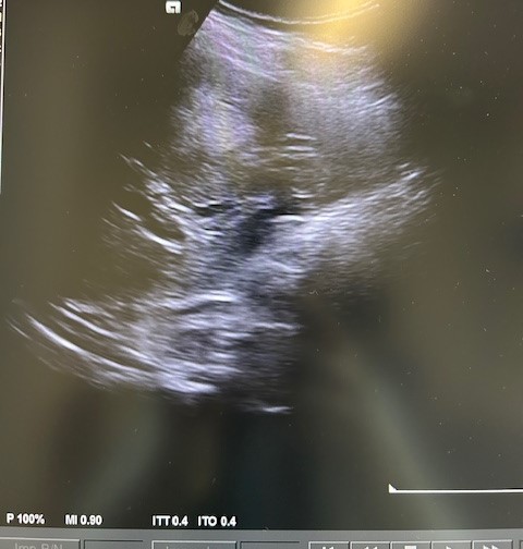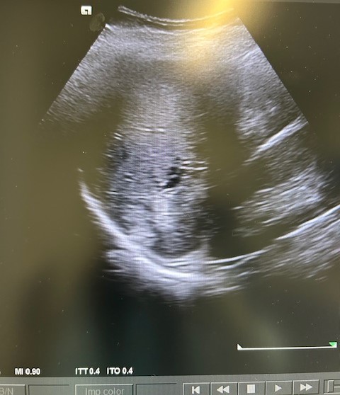 En la ecografía podemos apreciar hepatomegalia > 16 cm con múltiples imágenes en su interior hiperecogénicas sugestivas de LOE. No otros hallazgos a destacar.