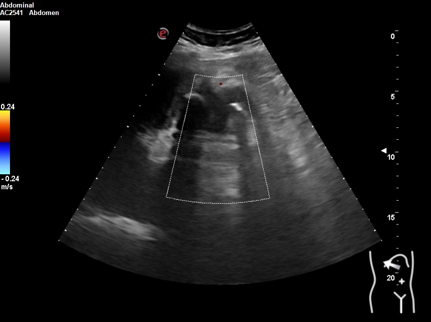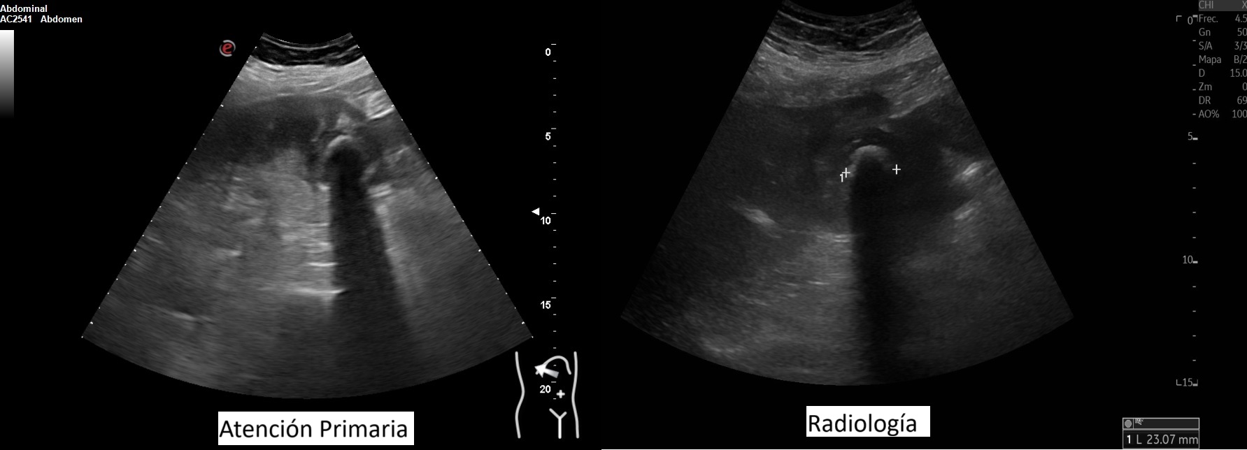 Varón de 75 años que acude por dolor abdominal de inicio en hipocondrio derecho y posteriormente en epigastrio con vómitos de 3 días de evolución. No fiebre. En la exploración física presenta subictericia y dolor a la palpación en epigastrio. Se decide realizar una ecografía en el centro.
