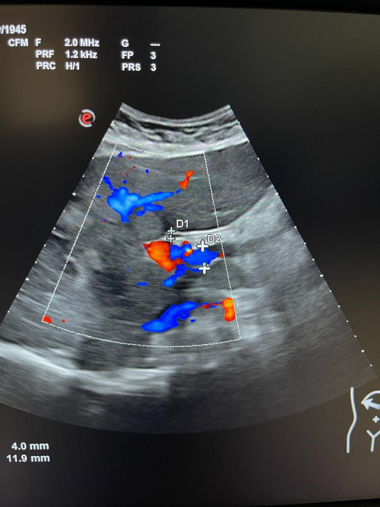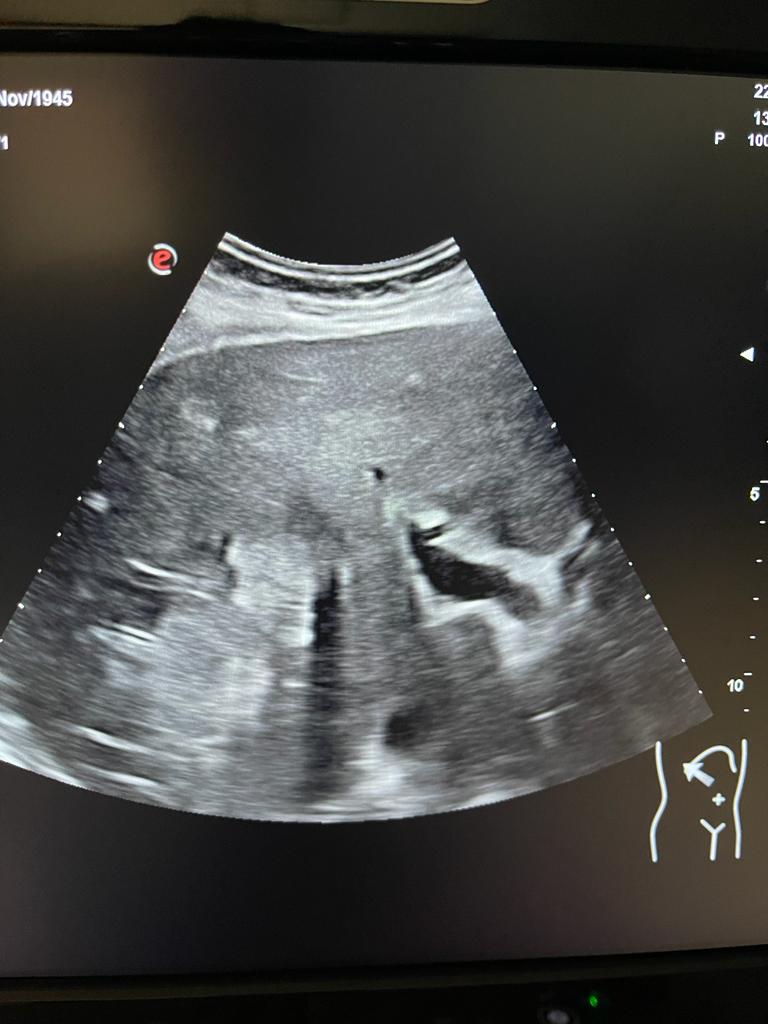 Se aprecia hígado heterogéneo con múltiples LOES hepáticas hiperecogénicas (una de ellas de unos 7x7 cm), sin captación de doppler. Al menos otras 2 LOES de menor tamaño presentan halo hipoecoico. Vesícula replecionada de contornos lisos y sin litiasis en su interior. Ambos riñones visualizados de tamaño normal y sin datos de hidronefrosis.