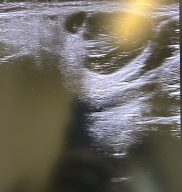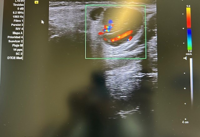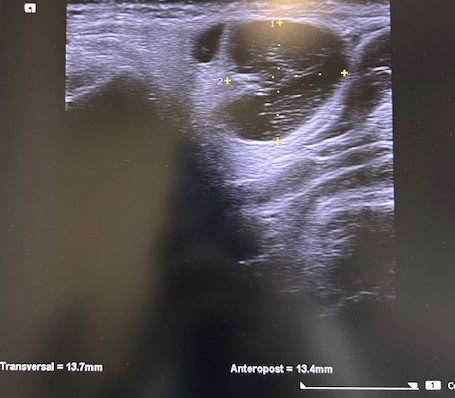 Ecografía POCUS: imagen heterogénea 1,9 x 1,7 asimétrica, con tabique en su interior, y captación de color (en modo C o con Doppler). Ante datos de mal de pronóstico solicitamos PAAF, analítica y ecografía reglada preferente.