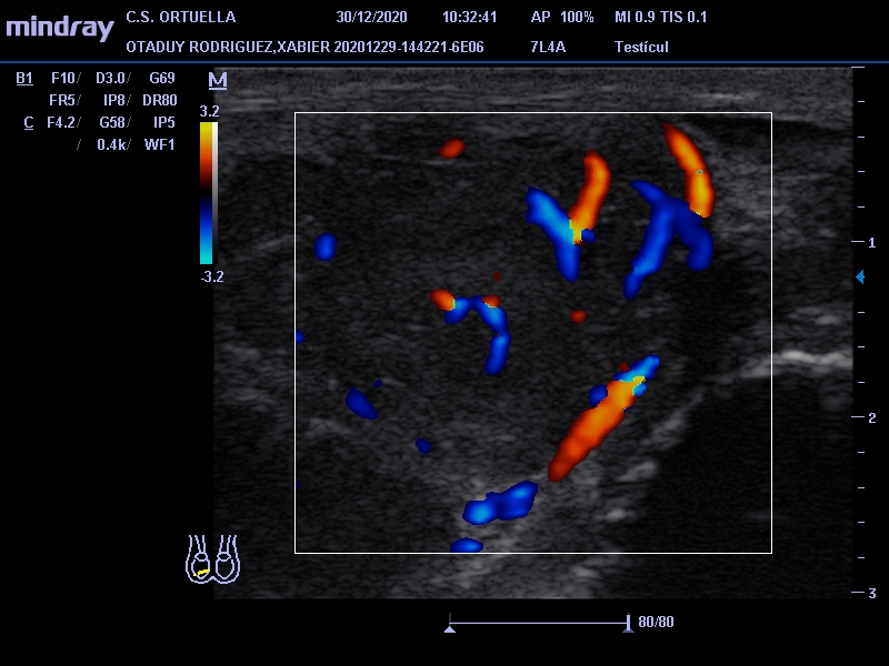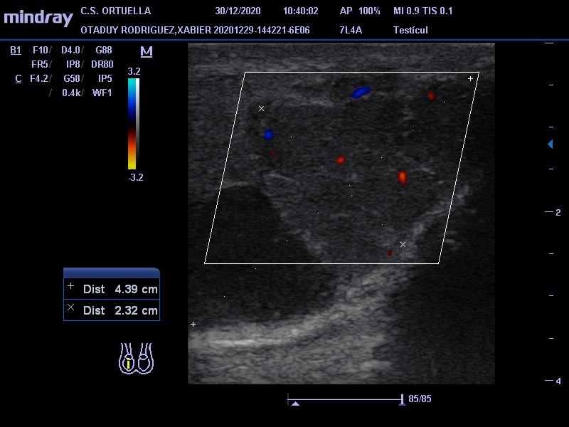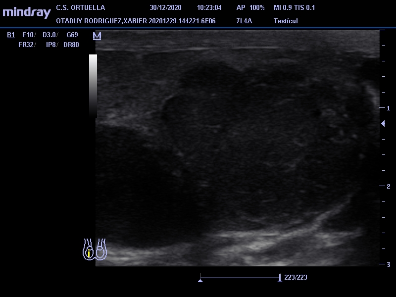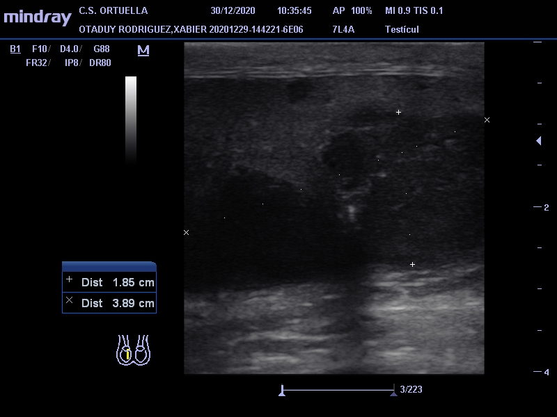 Sin antecedentes personales de interés. Varón de 31 años que acude por presentar desde hace un mes molestias en testículo derecho e hinchazón. En la exploración física se palpa induración en polo inferior, no dolorosa, sin signos inflamatorios. Se decide citar para ecografía en el Centro de Salud.