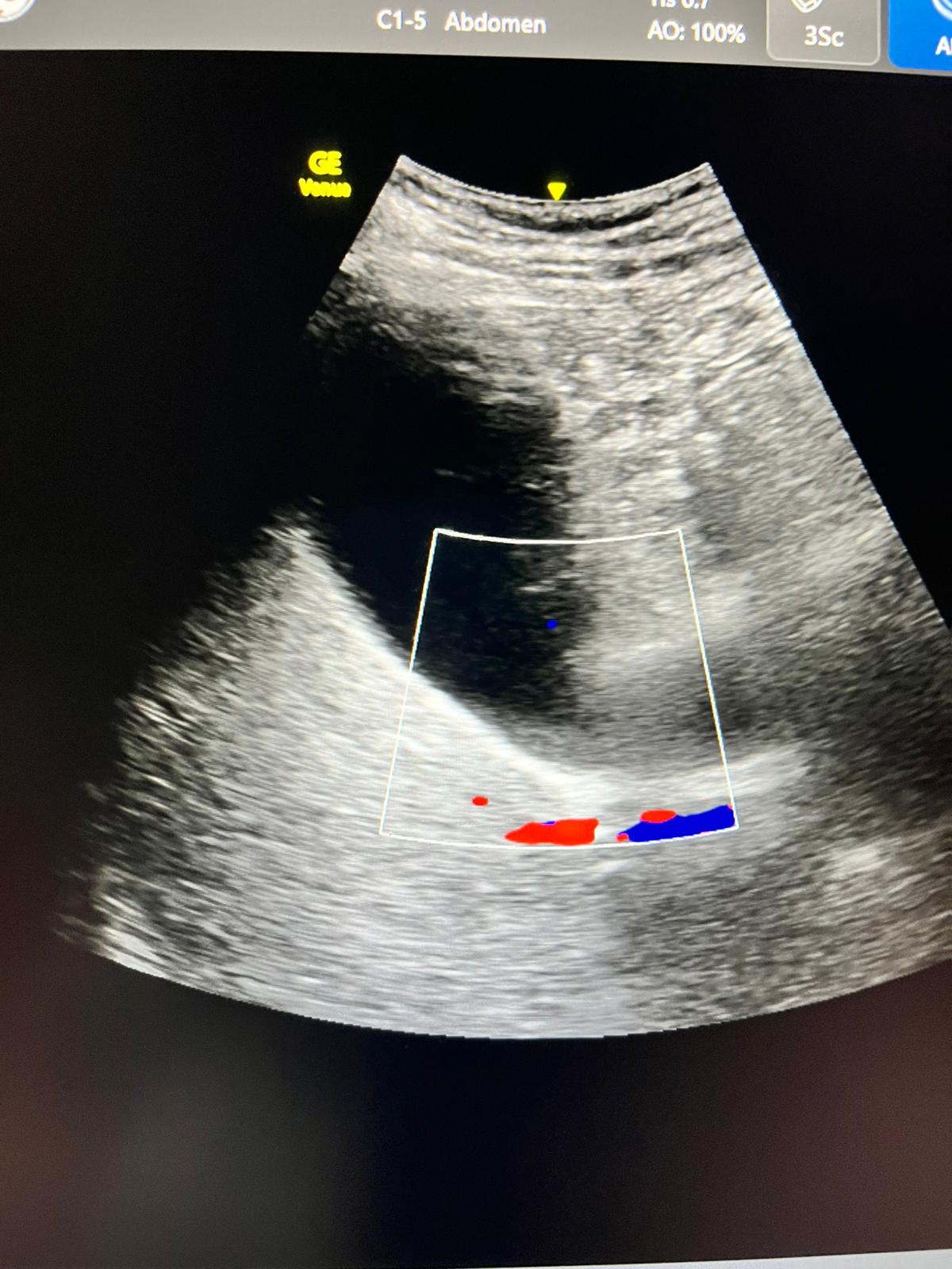 Abdomen blando, depresible, doloroso a la palpación en epigastrio. No datos de irritación peritoneal. PPRB negativa. AS: Hb: 12,9, plaquetas: 178, leucos: 14,5, glucosa: 172, tropos: 61, control 62, bilrrubina: 2,38, directa 1,8, PCR: 0,3, AST: 354, ALT: 249.