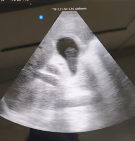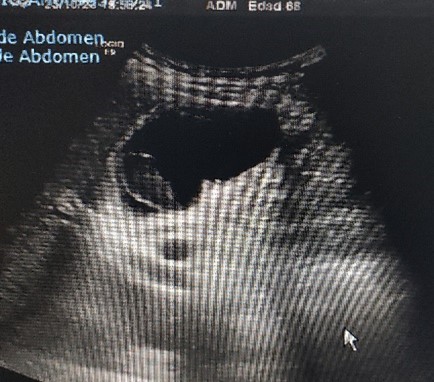 ECOGRAFIA CLÍNICA: Se aprecia vesicular biliar bien repleccionada con imagen en su interior redondeada, hipoecoica, sin sombra, Murphy ecográfico positivo.