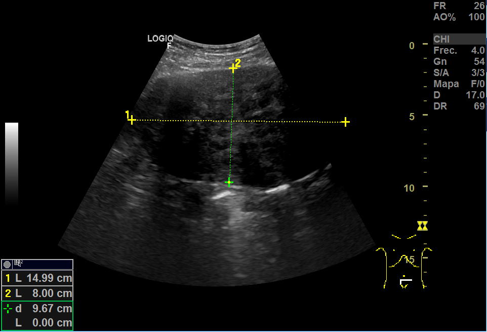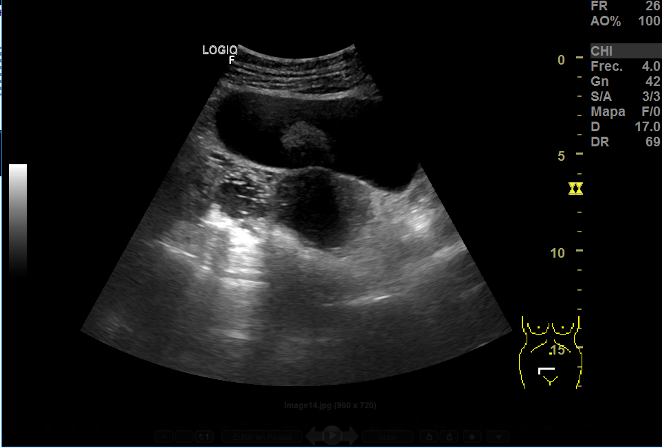 Realizamos una ecografía en el centro de salud y objetivamos, adyacente a útero, una imagen heterogénea de gran tamaño (15x8 cm), con vascularización, que podría corresponder a un mioma gigante. En anejo derecho, imagen redondeada de aproximadamente 3 cm en cuyo interior aparecen líneas hiperecogénicas en un fondo hipoecoico que podrían corresponder a teratoma, sin descartar otra patología. Ante la duda, derivamos a ginecología.