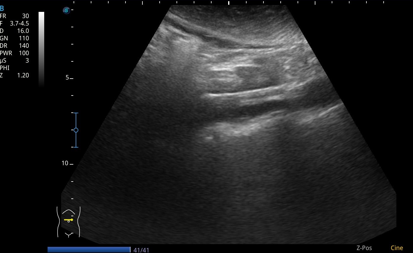 Se realiza ecografia a pie de cama que muestra como en el flanco derecho presenta silueta renal con un polo superior visible, sin poder definir el polo inferior, y la misma imagen en la silueta renal izquierda.