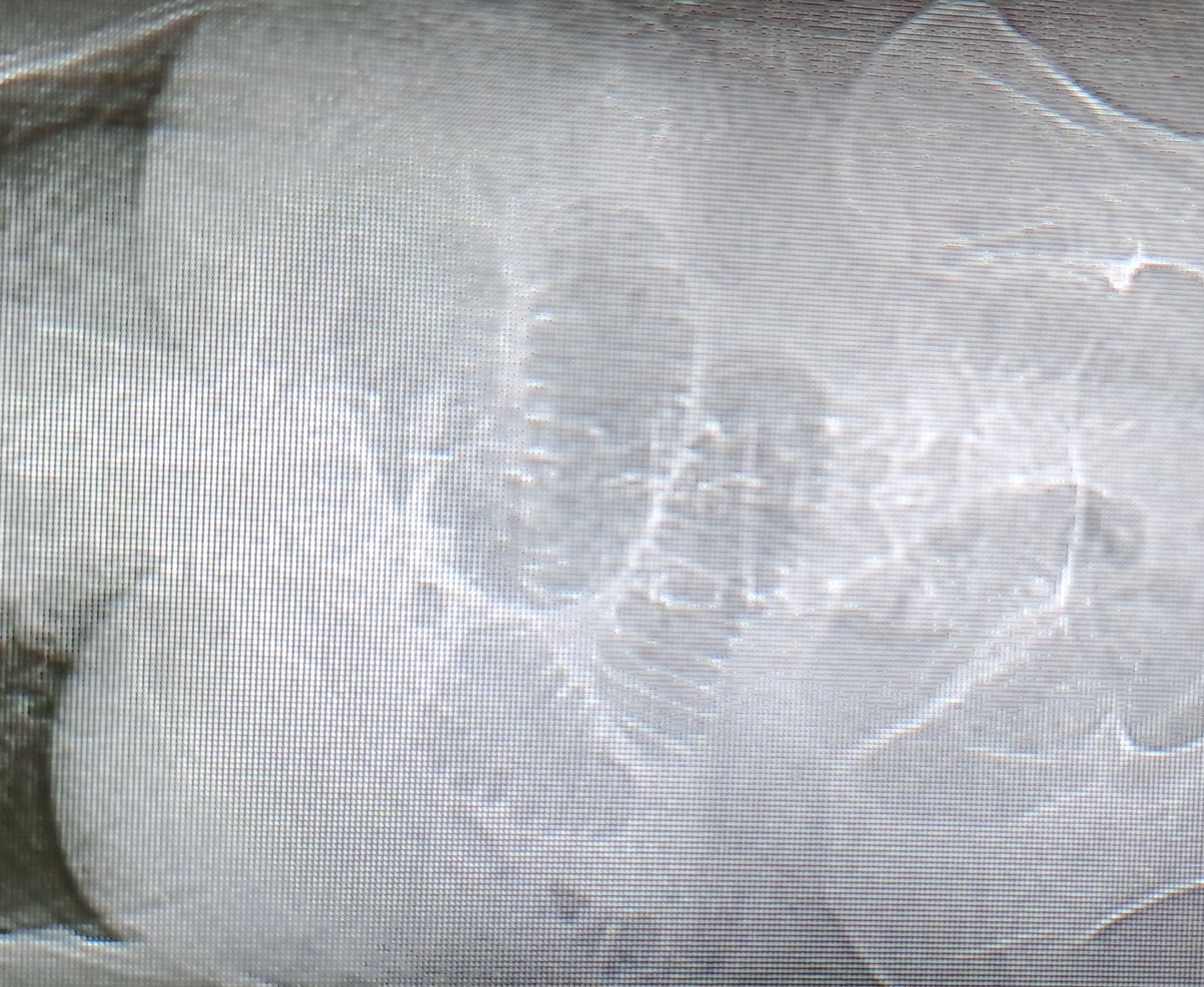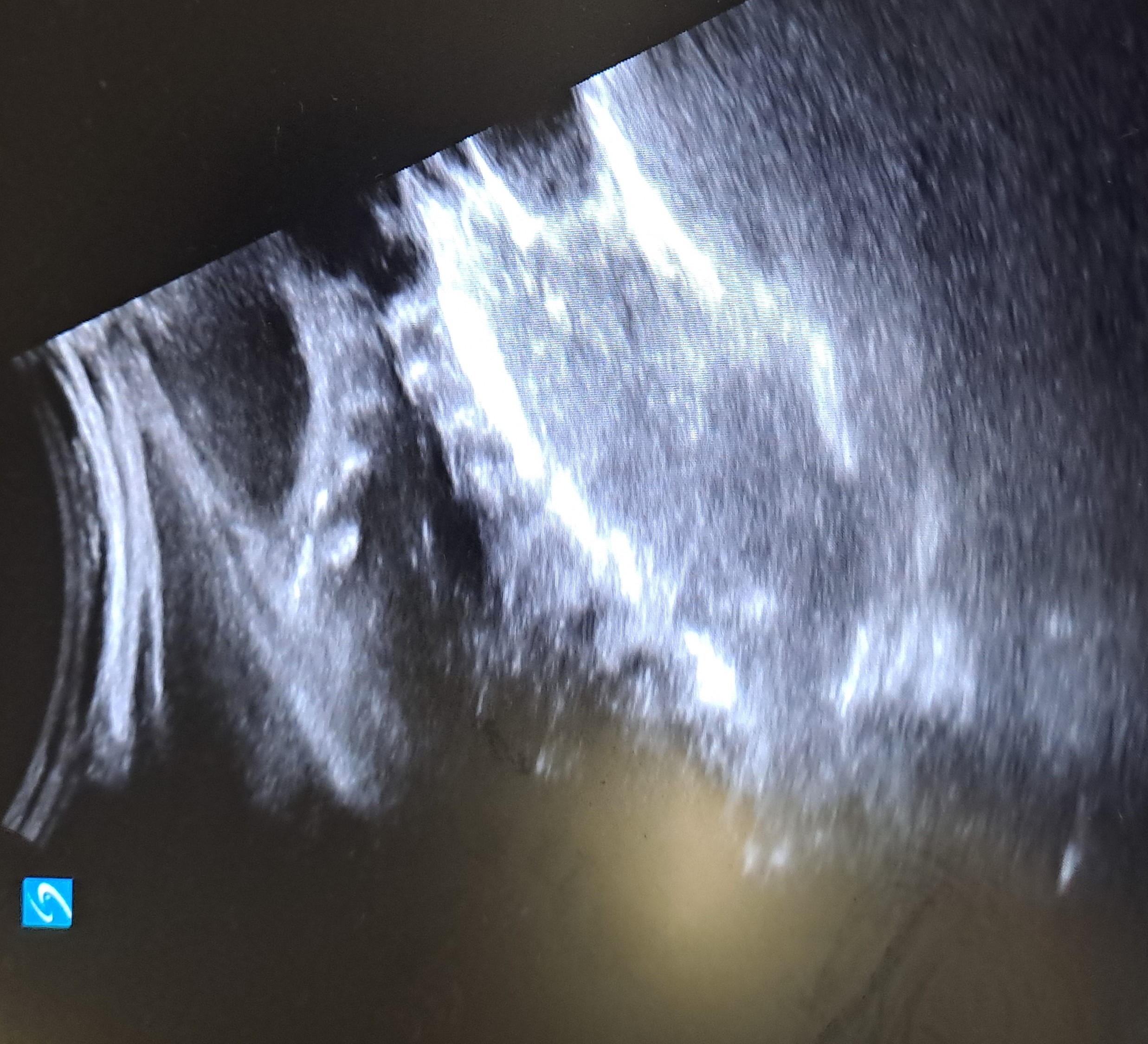 Se realiza ecografía clínica objetivando asas intestinales dilatadas con engrosamiento de paredes y ausencia de movimiento de asas intestinales.