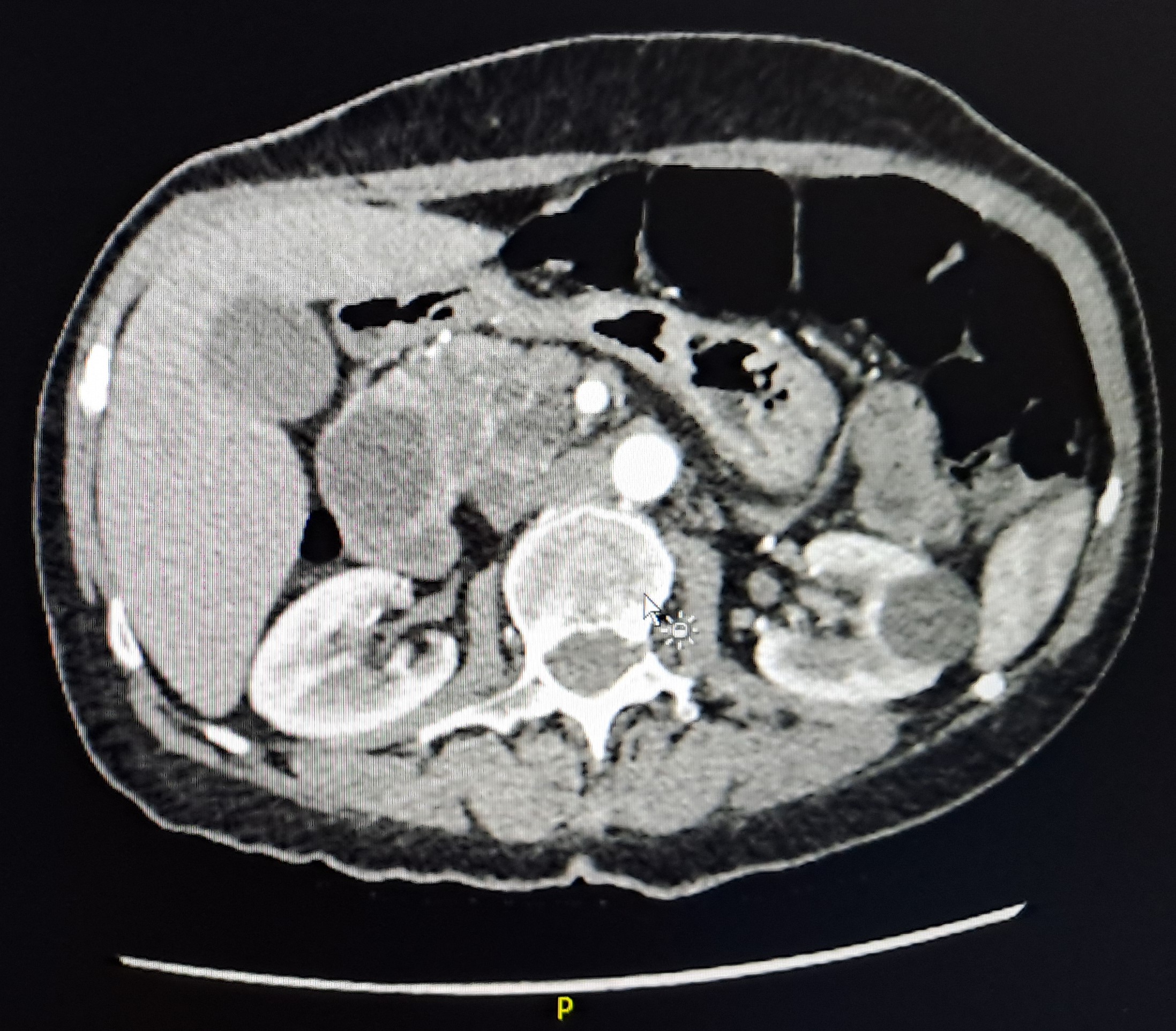 Ecografía abdominal: Hígado de bordes lisos y homogéneos, no lesiones ocupantes de espacio. Vesícula biliar no dilatada, no engrosamiento de paredes. Presencia de múltiples lesiones anecoecogénicas redondeadas en cabeza de páncreas, la mayor de unos 5cm de diámetro, no se objetivan lesiones en cuerpo y no se visualiza cola del páncreas. Riñones: no alteraciones en la ecogenicidad o tamaño.