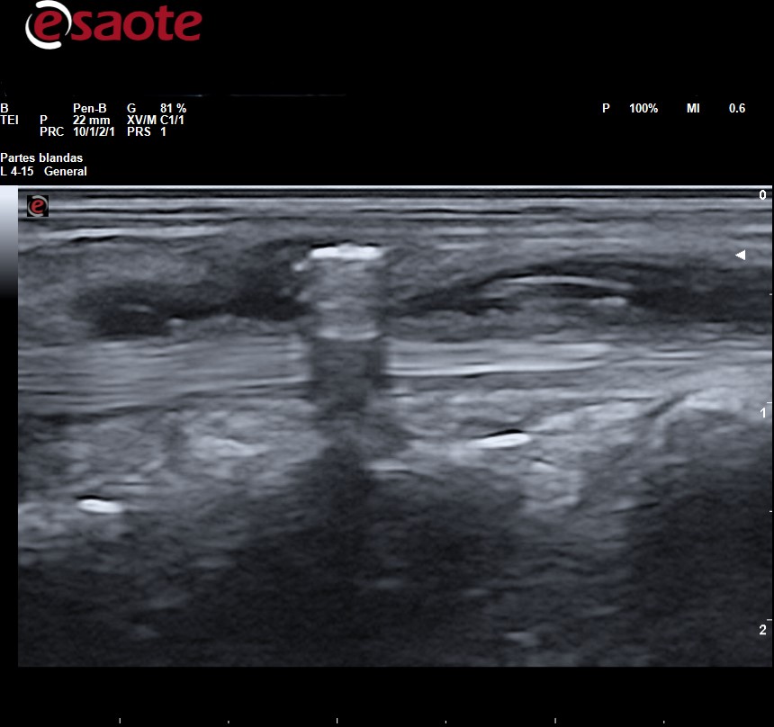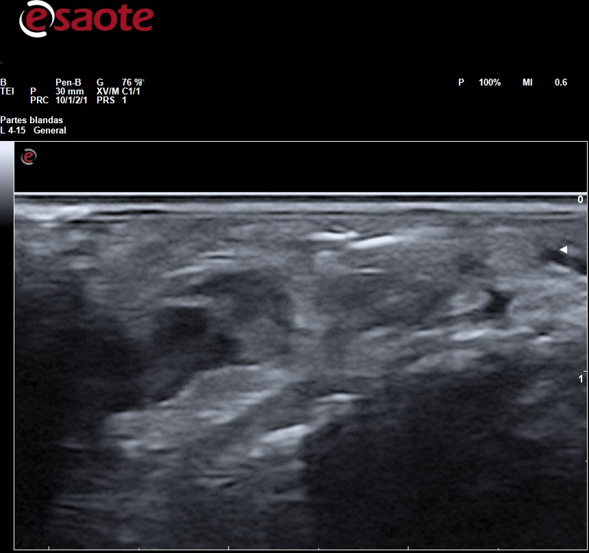 Exploración física: afebril, presenta dolor y tumefacción en el dorso de la mano, no datos de infección. El paciente nos relata que con el traumatismo se cortó con cristal. Ante el antecedente de traumatismo y el riesgo de la posible existencia de cuerpo extraño le realizamos ecografía de partes blandas con sonda lineal.
