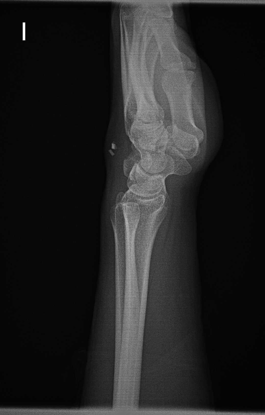 Realizamos Rx en la que se observa dos imágenes radiopacas en partes blandas del dorso de la mano.
