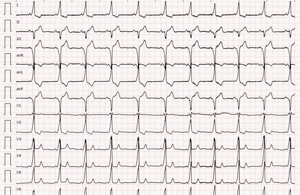 ECG: Ritmo sinusal a 75 lpm, eje -60º, PR corto de 0,08 s, QRS ancho con onda delta (negativa en V1, cara inferior y positiva en cara lateral), ST isoeléctrico con onda T negativa asimétrica en cara lateral.