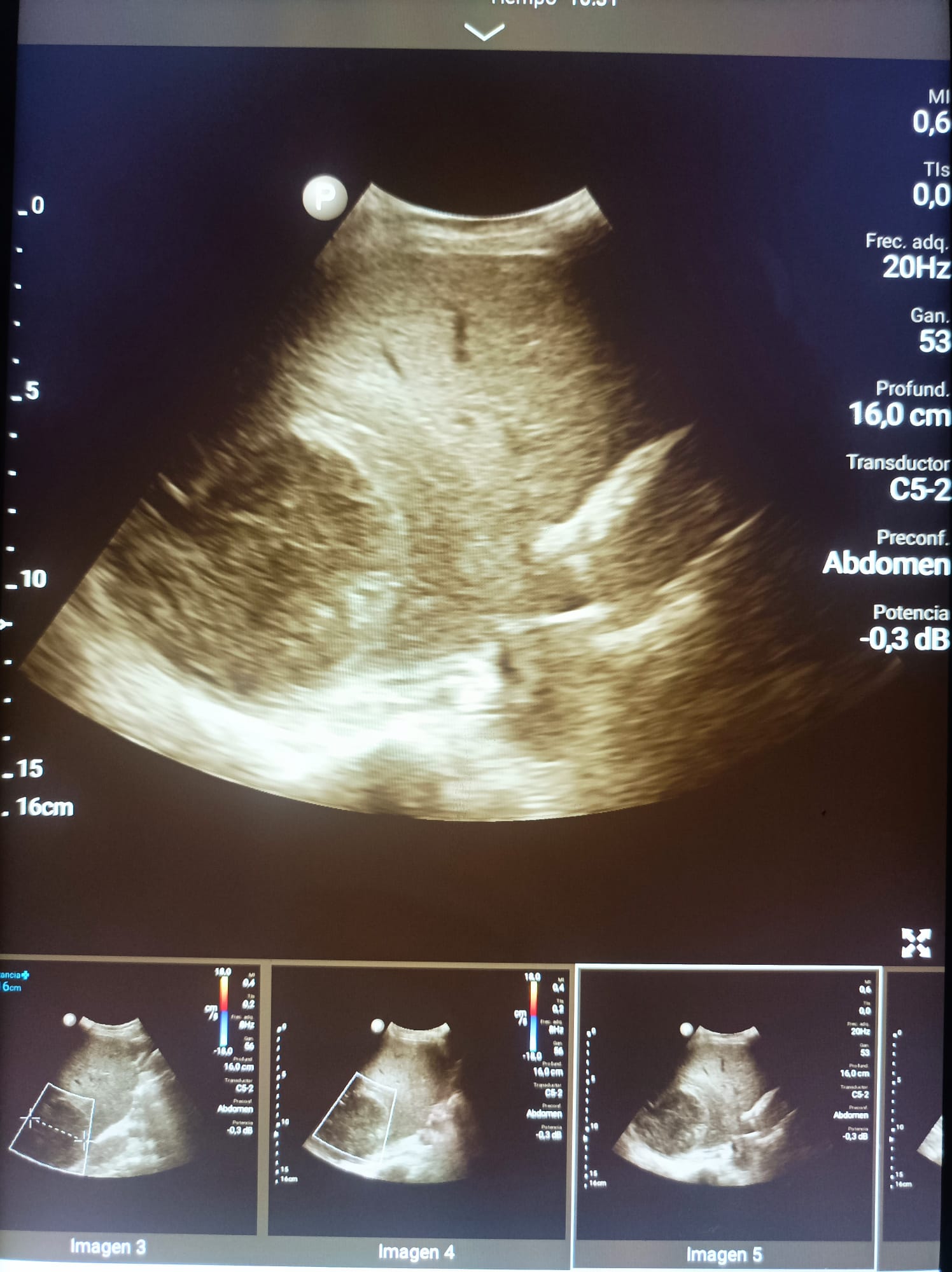 Disponíamos de una sonda convexa que nos ha permitido la realización de ecografías abdominales, pulmonares e incluso obstétricas en diferentes ámbitos; servicio de urgencias, servicio de cirugía general y medicina interna.