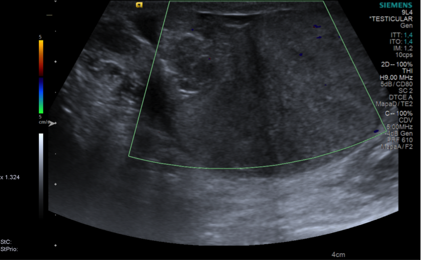 Realizamos ecografía doppler de testículo derecho en la que observamos testículo con ecoestructura heterogénea, con áreas hipoecoicas y ausencia de señal de flujo Doppler, compatible con torsión aguda, identifacando cordón espermático torsionado 360º.