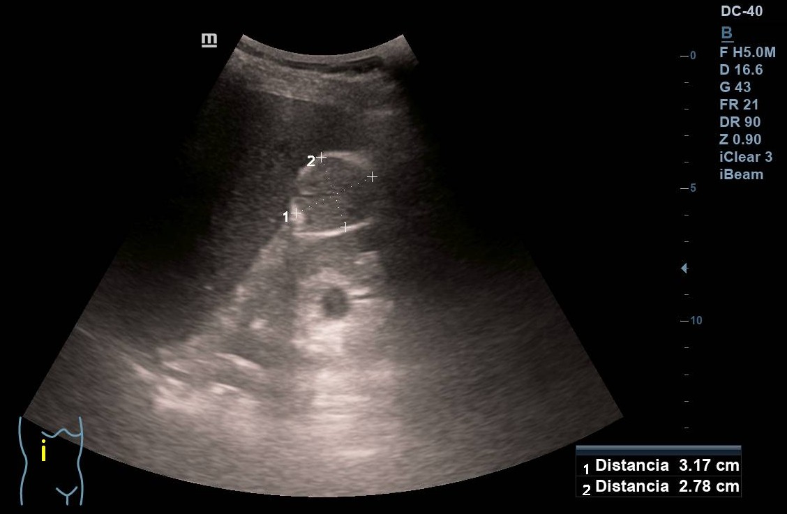 Ante la presencia de hematuria decidimos realizar una ecografía abdominal en el centro de salud. En la vejiga, insuficientemente replecionada, no encontramos lesiones. La próstata también es de tamaño y aspecto normales. En el riñón derecho se observa una masa de unos 3 cm con bordes irregulares.