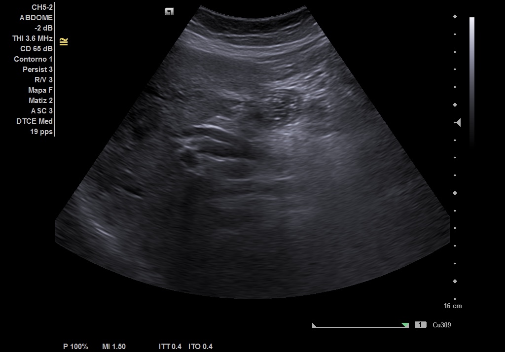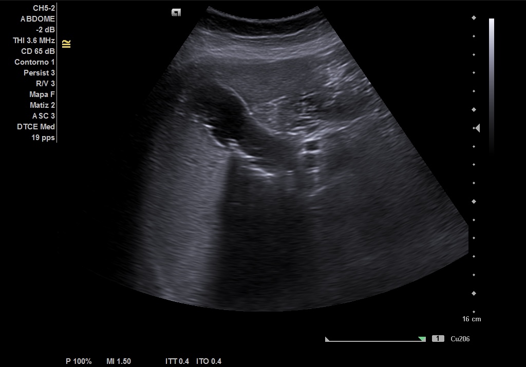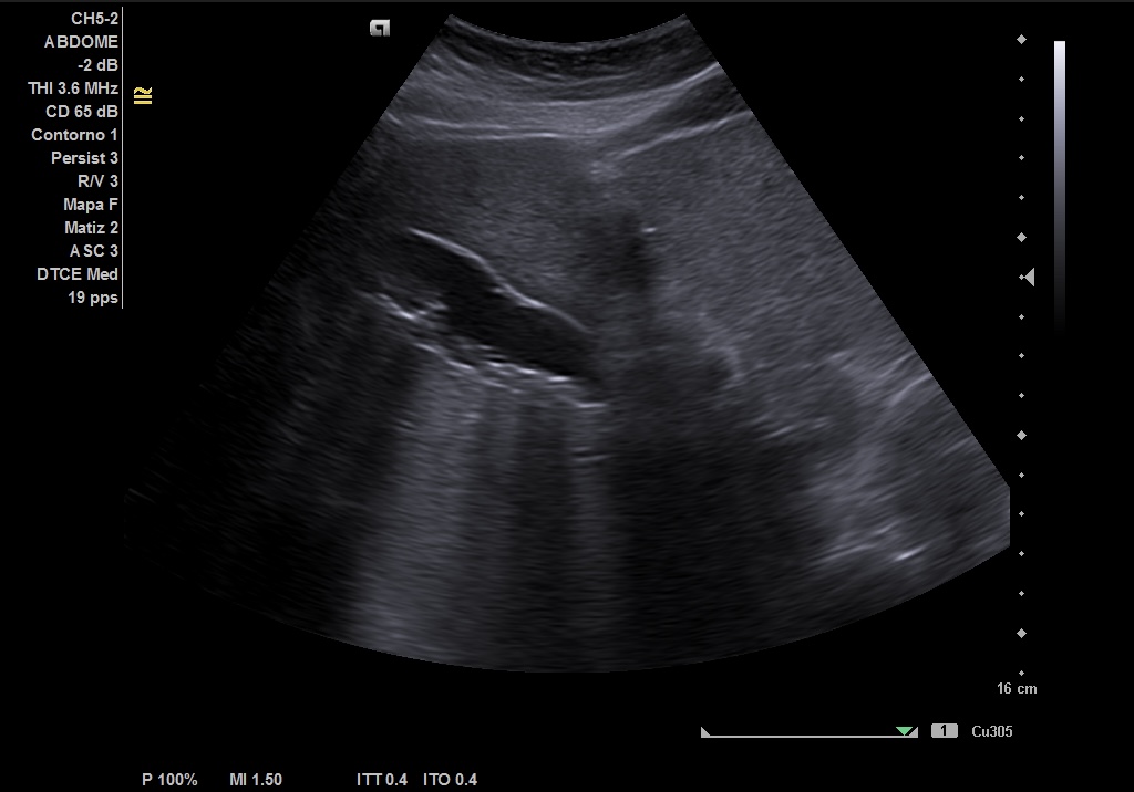 Realizamos ecografía abdominal en el Centro de Salud en el momento de la consulta y visualizamos: Colelitiasis y dilatación de la vía intra y extrashepática sin observar claramente causa obstructiva.