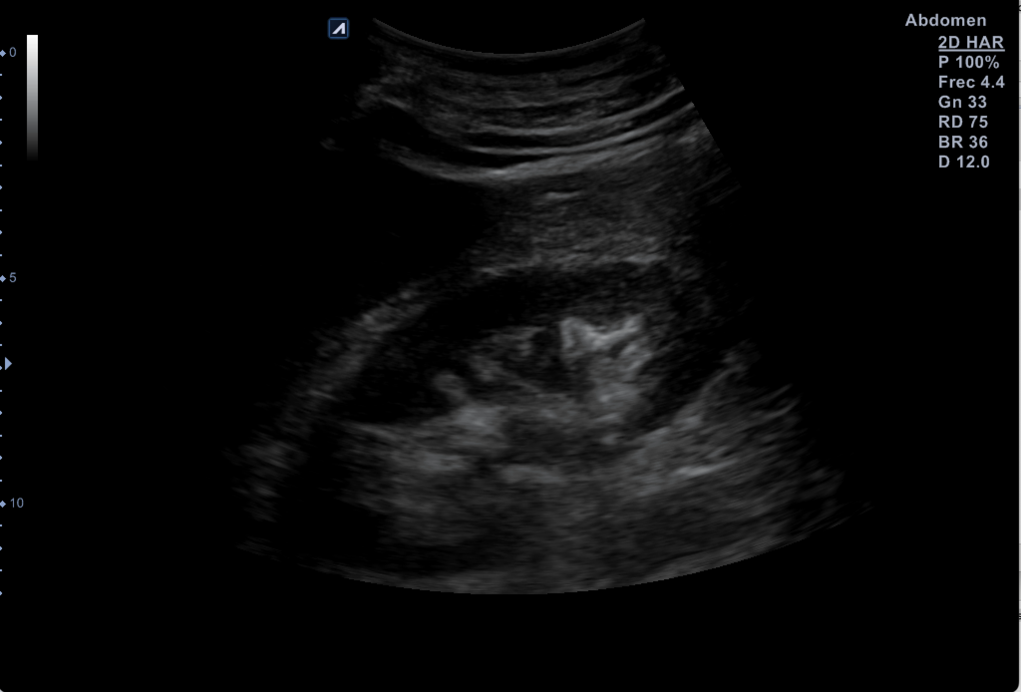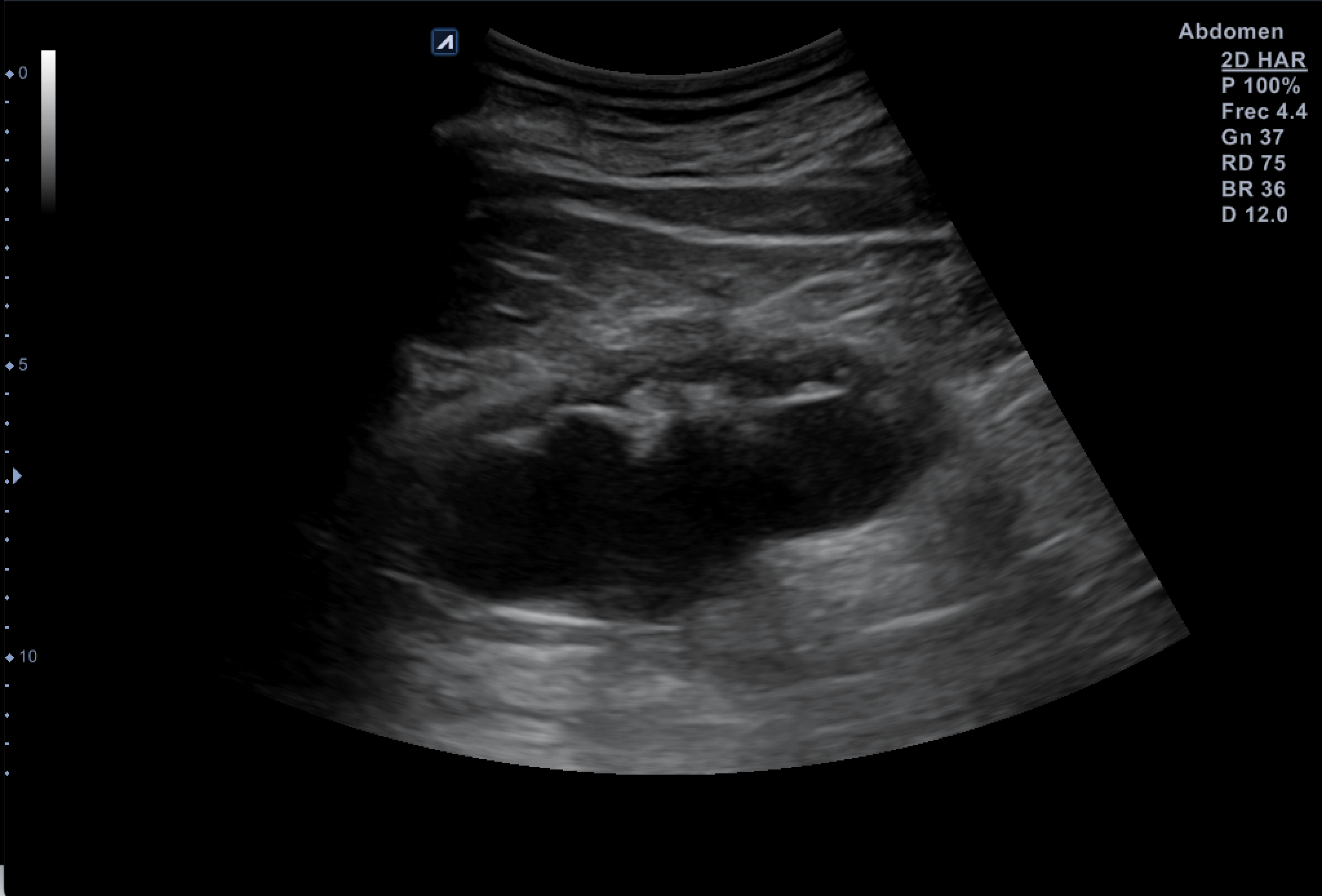 Tras valoración vesicoprostática con vejiga normal, jet vesicales visibles con próstata de 45 cc y residuo postmiccional mínimo. Riñón derecho como normal de tamaño y morfología sin dilataciones pielocaliciales (11 cm de tamaño). El Riñón Izquierdo (RI: 9 cm) presentaba una hidronefrosis grado IV y atrofia cortical con pelvis renal distendida, no consiguiendo detectar la causa obstructiva y considerando la posibilidad de una estenosis de la unión pieloureteral y como segunda opción una litiasis ureteral pese a la normalidad de los jets vesicales.