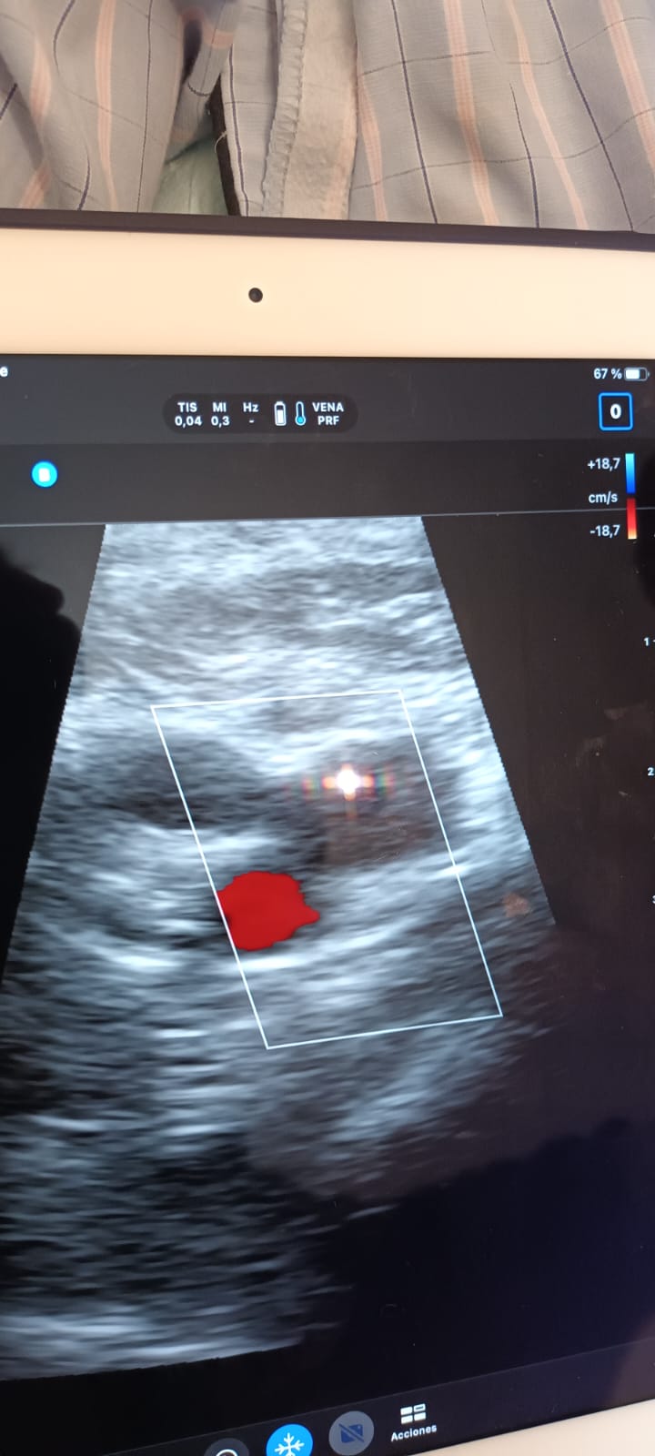 A la exploración, objetivamos discreto aumento de volumen de miembro inferior derecho, con algo de edema que deja fóvea en tobillo derecho y en zonas de declive de esta pierna, sin otros hallazgos llamativos. Por este motivo, decidimos realizar una ecografía con sonda portátil.