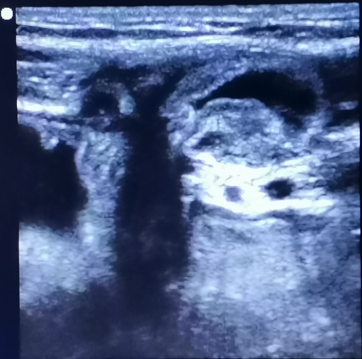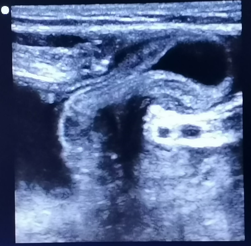 Ecografía a pie de cama: protusión de contenido hipoecogénico a través de agujero herniario, que aumenta su diámetro con maniobra de Valsalva y que no se reduce por completo; compatible con hernia inguinocrural no reductible.