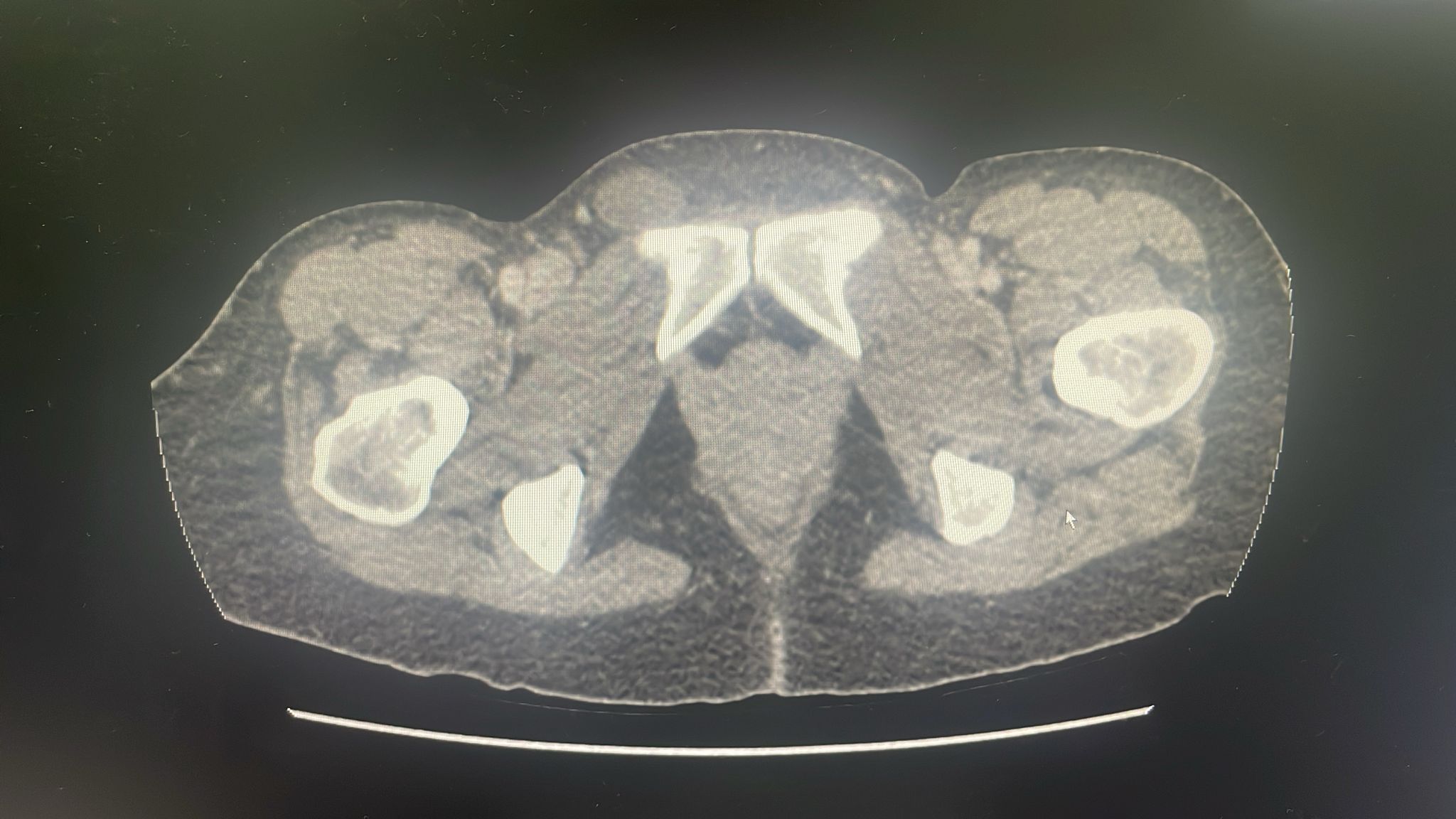 Dada la ausencia de dolor en tumoración inguinal, pero con la sospecha de obstrucción intestinal 2º a hernia inguinocrural derecha incarcerada, se decide realización de TAC abdomen, que confirma obstrucción intestinal con cambio de brusco de calibre en hernia crural derecha que contiene asa de íleon distal con hiporrealce parietal en su parte declive que podría traducir sufrimiento a este nivel.