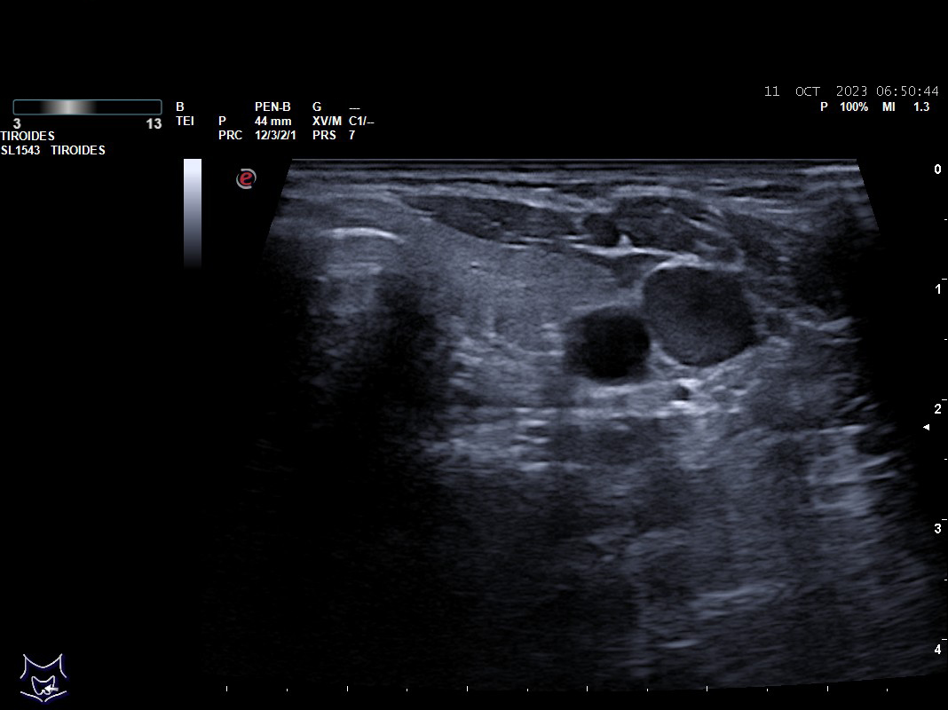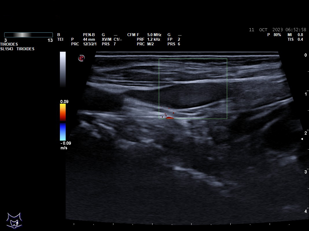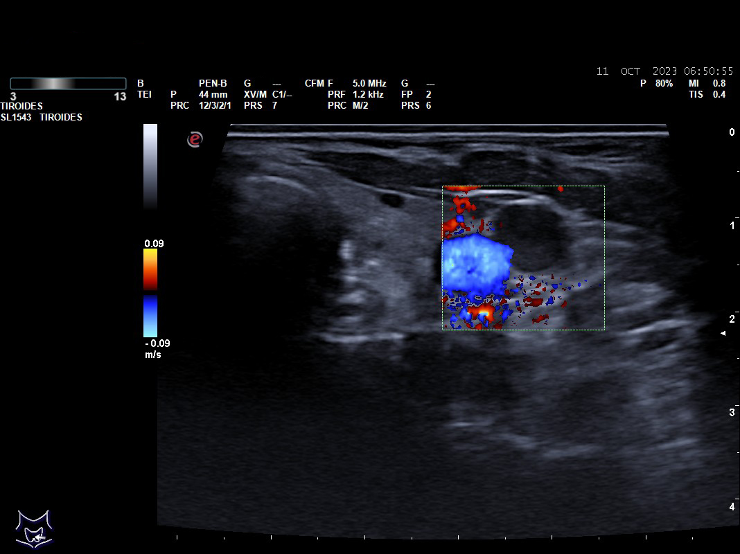 Hallazgos ecográficos: nódulos tiroideos subcentimétricos sin cambios, yugular interna izda con contenido discretamente hiperecogénico que no capta Doppler y colapsabilidad incompleta.