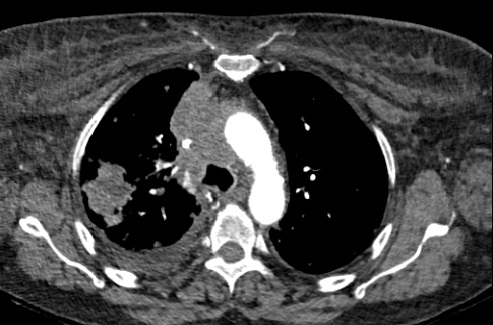 Se solicitó analítica, destacando aumento de reactantes de fase aguda, elevación de dímero D y alcalosis respiratoria. En la radiografía de tórax se identificó ensanchamiento mediastínico y nódulos bilaterales. Se realizó TC de tórax, con hallazgos de masa pulmonar en lóbulo superior derecho y múltiples adenopatías, constituyendo en mediastino anterior un conglomerado con severa compresión extrínseca de la vena cava superior.