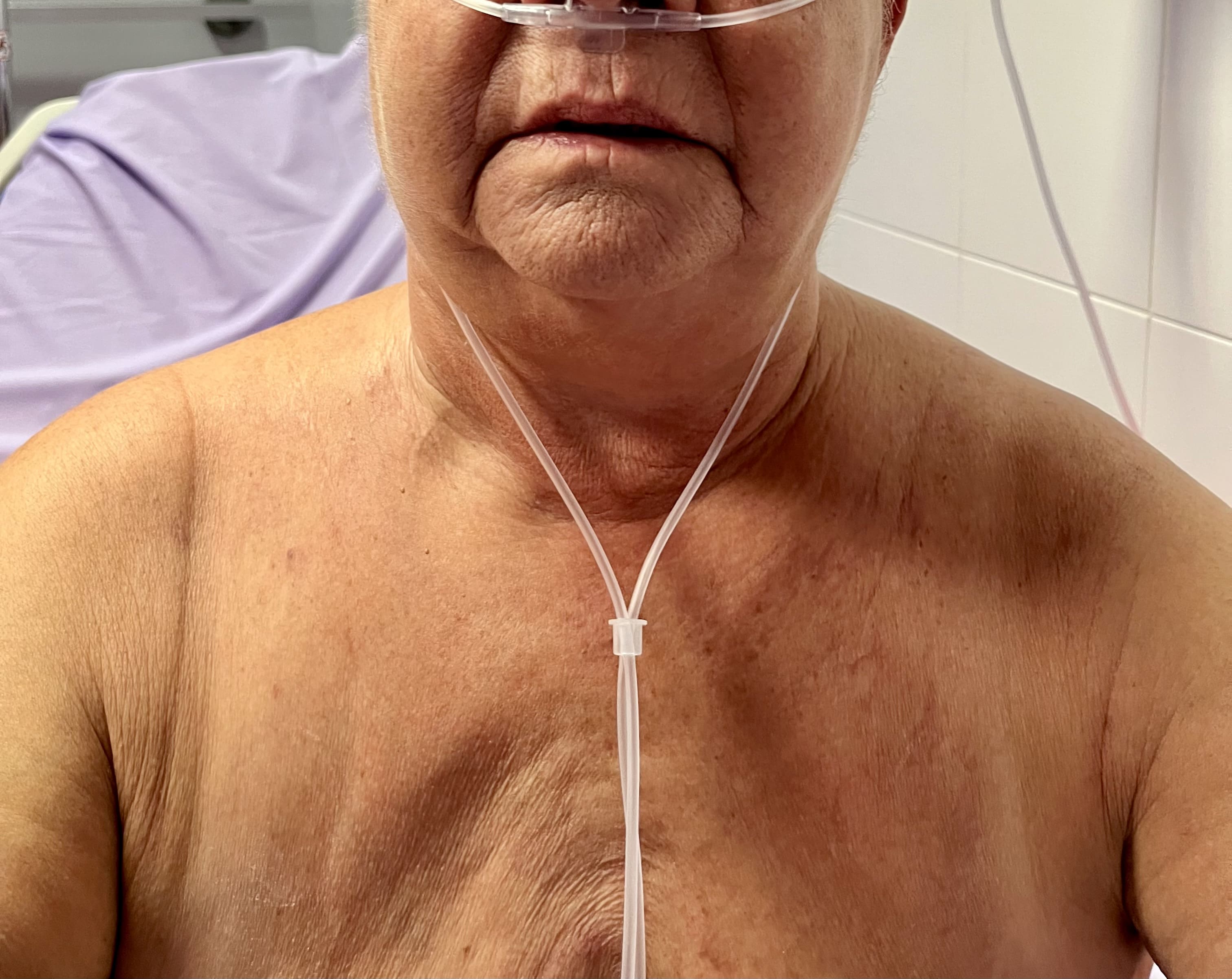 A la exploración física se encontraba hipotensa, normocárdica, afebril y con taquipnea superficial. Destacaba edema y eritema de ambas mamas, sin nódulos, adenopatías axilares o secreción en pezones. Asimismo, presentaba eritema de hemitórax superior con telangiectasias, edema cervical y de miembro superior izquierdo. Auscultación cardiopulmonar sin hallazgos y extremidades inferiores sin signos de trombosis.