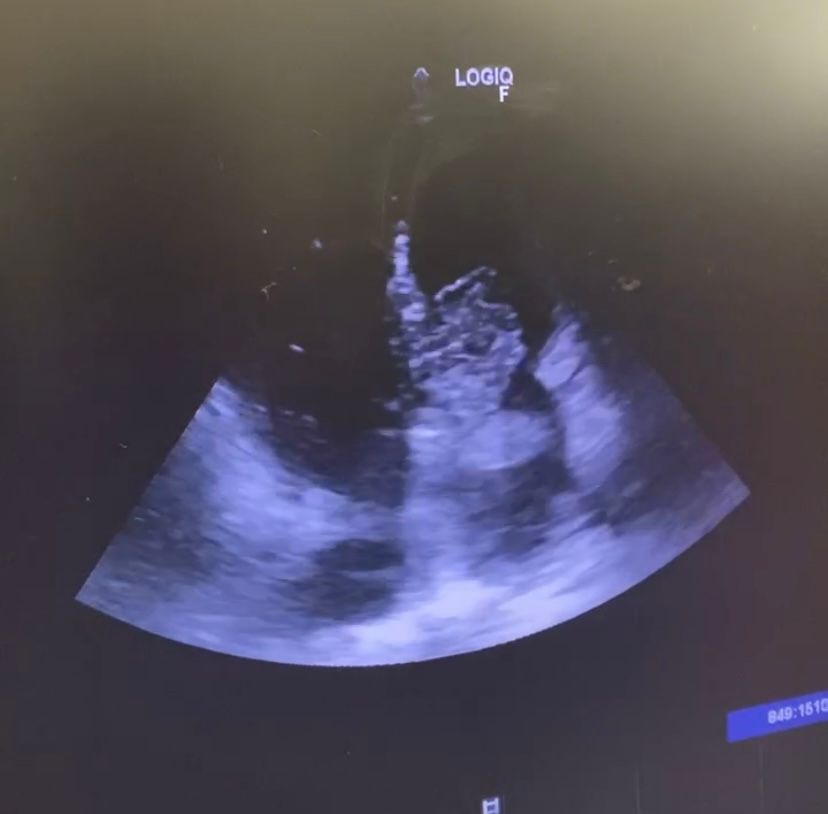 Se realiza ecografía trastorácica a pie de cama objetivándose gran masa a nivel de aurícula izquierda compatible con Mixoma auricular que protruye hacia válvula mitral generando obstrucción severa confirmándose en ecografía reglada posterior.