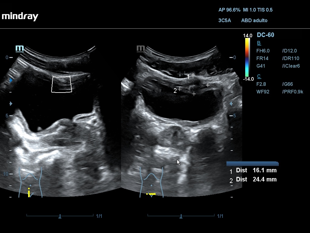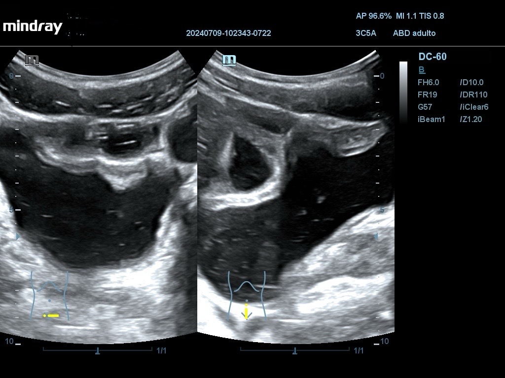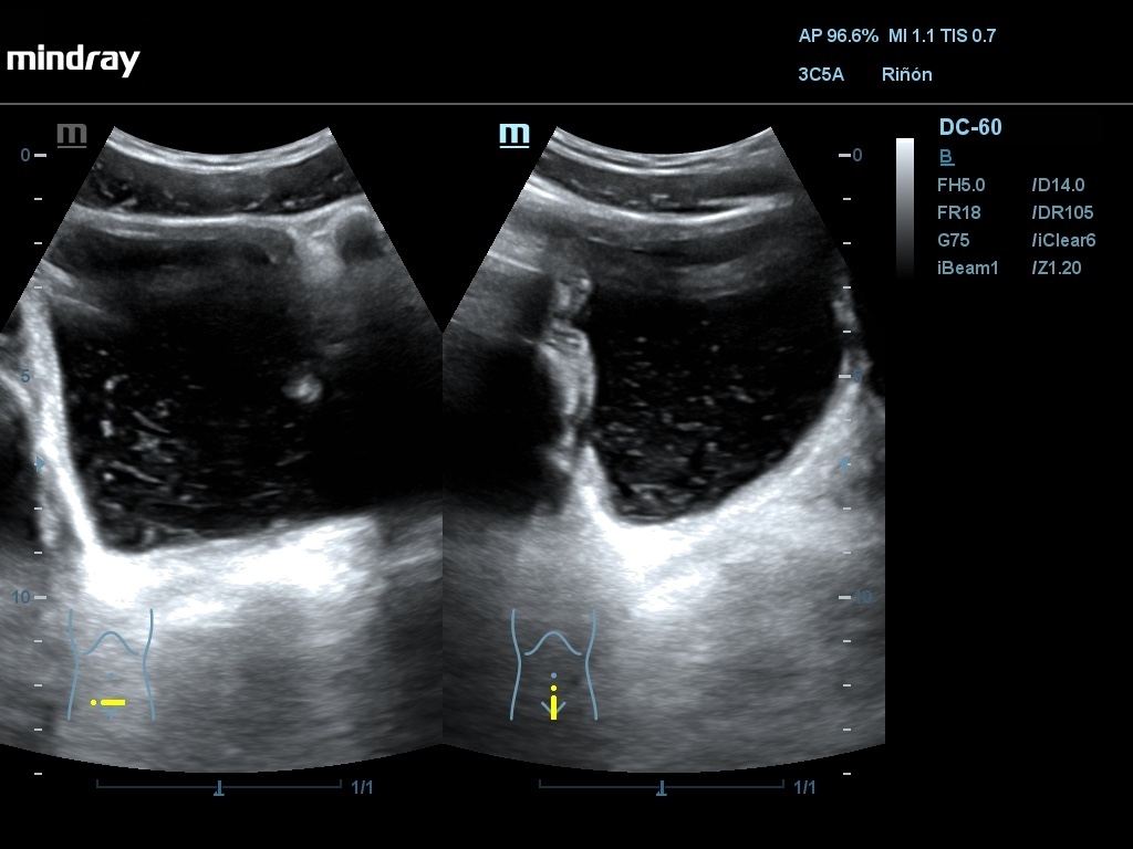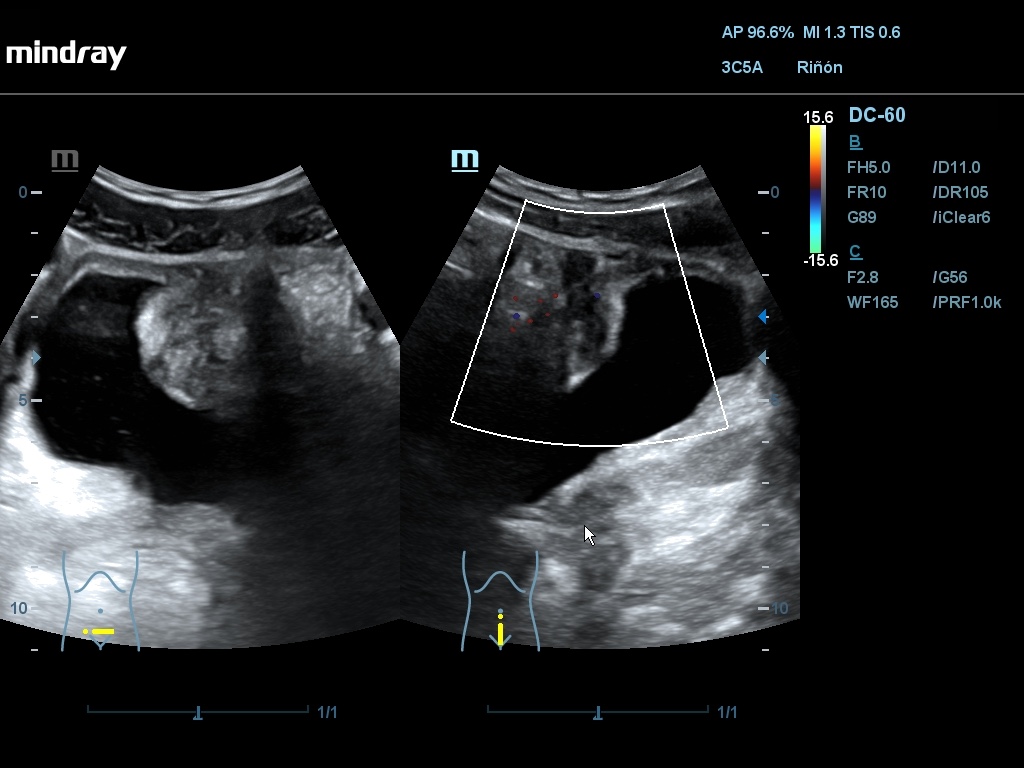 Ecografía: Se han observado varias imágenes poco habituales en vejiga urinaria: imágenes hiperecogénicas flotantes sin sombra posterior, móviles (detritus), engrosamiento de pared vesical que simula una vejiga no distendida con áreas anecoicas, pared con imagen en doble carril, masa vesical.