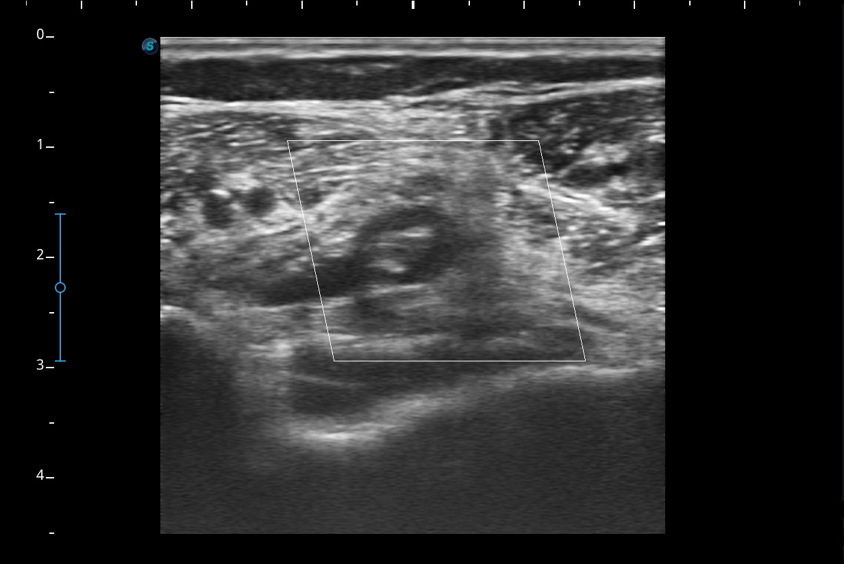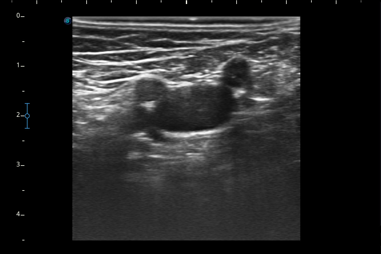 Mujer de 44 años, que presenta desde hace 2-3 semanas dolor e impotencia funcional en la pierna derecha con aumento de volumen y eritema de pantorrilla ipsilateral que en un inicio se trató como rotura fibrilar para la que se pauta reposo y tratamiento analgésico oral. Ha mejorado muy levemente pero persiste dolor en el hueco popliteo e impotencia funcional.Descripción de los hallazgos ecográficos y las imágenes más relevantes para la resolución del caso