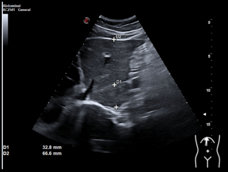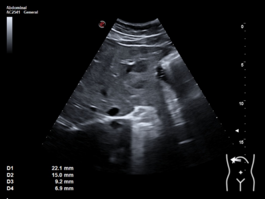 Ante la ausencia de mejoría y pérdida de peso de 5 kilos se solicitó analítica, mostrando una ligera leucocitosis (11.200), y sangre oculta en heces y Helicobacter Pylori en heces con resultado negativo. Se realizó ecografía clínica tras la consulta.