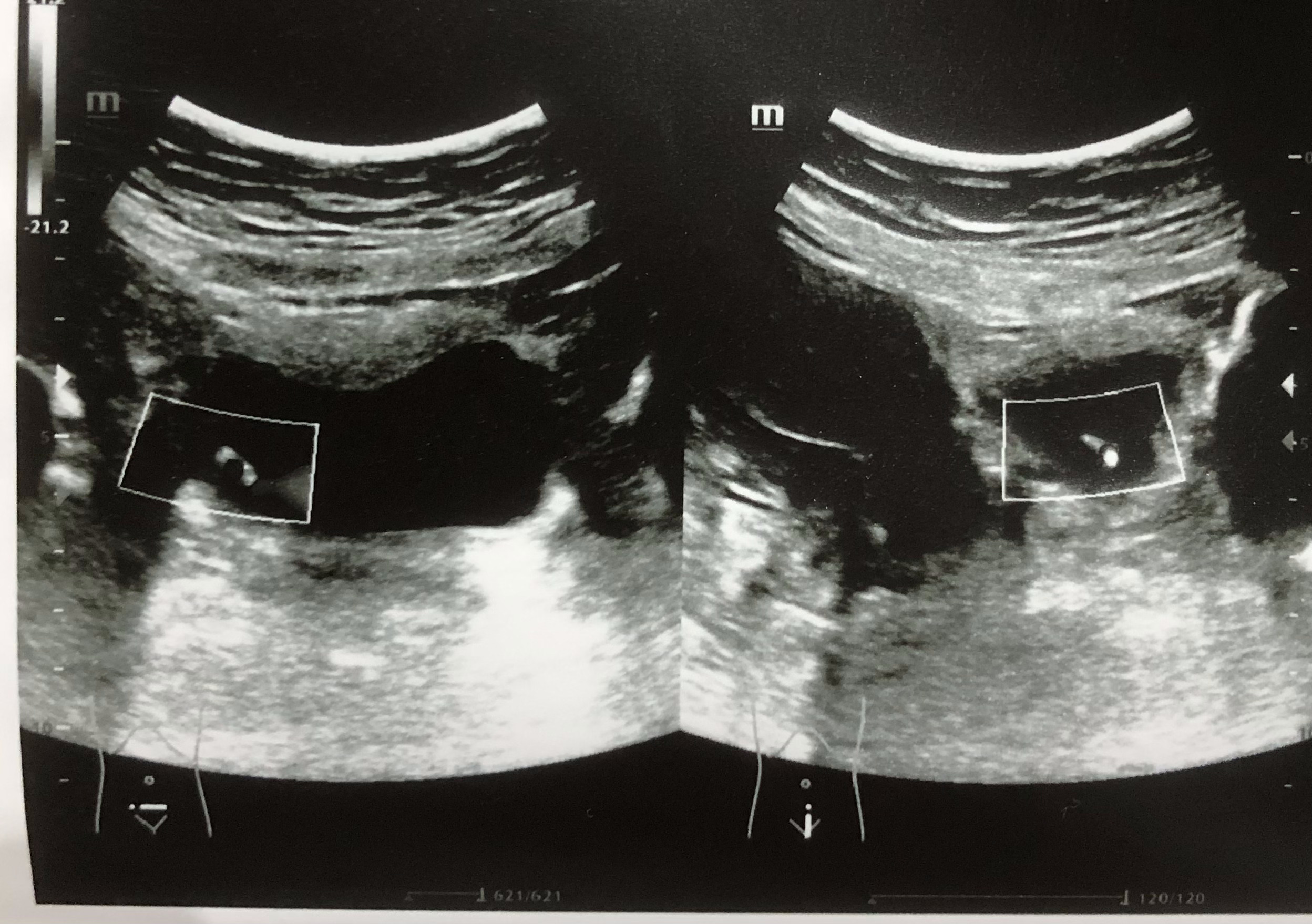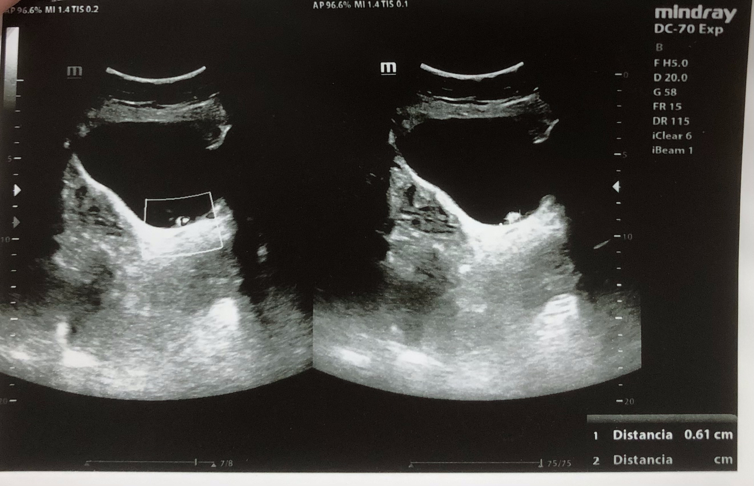 Se realiza ecografía renal donde se aprecia lesión hiperecogénica redondeada en pared inferior derecha de vejiga sin sombra posterior de 0,7 x 0,61 cm, que no se moviliza con cambios posturales de la paciente. Centelleo dudoso.